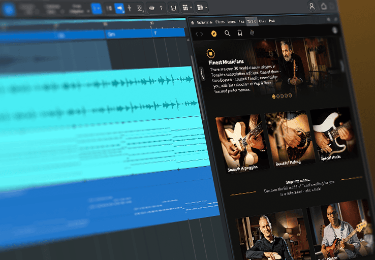 Browse acoustic and electric guitar performances — called Tonalics — and Preview them. Tonalics instantly adapt to your song’s chords, key, and tempo, so you hear musical ideas exactly where they belong. Fast, intuitive, and always musical.